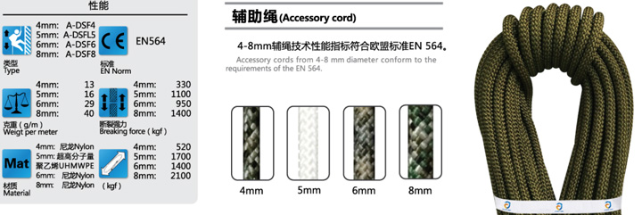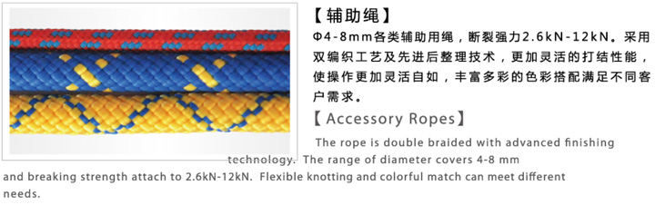 φ4mm-8mm,各種輔助用繩,破裂強力2.6KN-12KN,采用雙編織工藝及先進后整理技術,更加靈活的打結性能,使操作更加靈活自如,豐富多彩的色彩搭配滿足不同客戶需求。